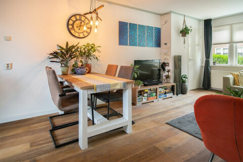 Binnenkomst is in de lichte woonkamer, voorzien van airconditioning – ideaal voor warme zomerdagen. De open keuken is praktisch ingericht en biedt direct toegang tot de ruime, fraai aangelegde tuin met handige berging; perfect voor het opbergen van fietsen en tuinspullen of om gewoon lekker van de buitenruimte te genieten.