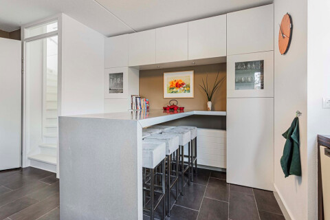 De woning beschikt over een ruime, lichte woonkamer met een sfeervolle gashaard en grote raampartijen. Bij de bouw en afwerking is gebruikgemaakt van hoogwaardige materialen, wat direct terug te zien is in het verfijnde niveau van comfort en duurzaamheid. De separate keuken is volledig uitgerust met moderne inbouwapparatuur en beschikt over een gezellige bar, perfect om aan te ontbijten of te borrelen.